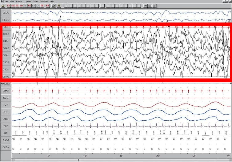 Um exemplo de ondas cerebrais que aparecem durante um dos estágios do sono.