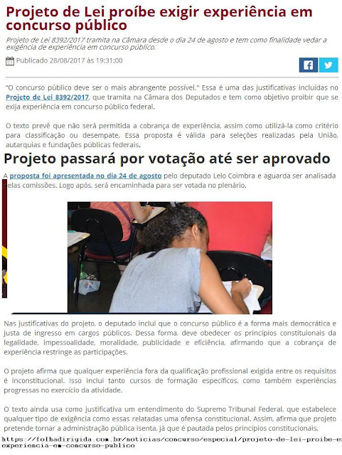 Este trecho é parte de um conteúdo que pode ser compartilhado utilizando o link do site: https://folhadirigida.com.br/noticias/concurso/especial/projeto-de-lei-proibe-exigir-experiencia-em-concurso-publico ou através ferramentas oferecidas na página. Textos da Folha Dirigida estão protegidos de acordo com seu direito autoral. Não reproduza o conteúdo da empresa, em qualquer meio de comunicação, eletrônico ou impresso, sem a devida referência de autoria. Essas regras têm como objetivo proteger o investimento que a Folha Dirigida faz em sua propriedade intelectual.
