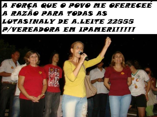 A EXPECTATIVA É GRANDE PARA TODOS!DIA 07 DE OUTUBRO ESTÁ CHEGANDO. DURANTE ESTES MESES, MUITO TRABALHO, DE PORTA EM PORTA, APERTANDO A MÃO DO CIDADÃO, OLHANDO DENTRO DOS OLHOS, NÃO PROMETENDO NADA, PEDINDO PARA TRABALHAR POR ELE, DESENVOLVER PROJETOS E COM MUITA HUMILDADE, "O VOTO DE SUA CONFIANÇA". A LUTA É DIFÍCIL.O POVO ESTÁ DESACREDITADO, MAS É CARINHOSO, SE HÁ SINCERIDADE NÃO ME COMPETE JULGAR O POVO, MINHA PROPOSTA É TRABALHAR PARA ELE E POR ELE, ATRAVÉS DE LEGISLAR E DA SUA REPRESENTAÇÃO POLÍTICA. UM POVO SIMPLES, DE MUITA SABEDORIA, TIVE UM APRENDIZADO NESTES MESES QUE É INCRÍVEL!E SEI QUE, VOU APROVEITÁ-LO PELO RESTO DA MINHA VIDA! SER POLÍTICA, ASSIM COMO SER ENGENHEIRA, MÉDICA, PROFESSORA, EXIGE ESFORÇOS E DEDICAÇÃO, MAS QUANDO SE GOSTA, É CANSATIVO E PRAZEIROSO, REALIZA, MAS POR OUTRO LADO, NÃO É ILUSÓRIO O FATO DE QUE SE TRABALHA MUITO, SE LUTA MUITO, SE ESTUDA AINDA MAIS NAS ELABORAÇÕES DOS PROJETOS, E DISTO QUE DEPENDE SUAS APROVAÇÕES OU REJEIÇÕES.NALY